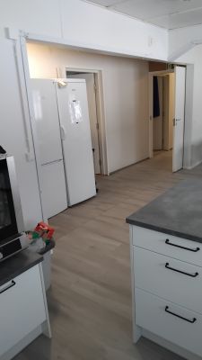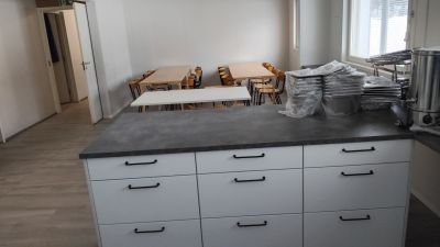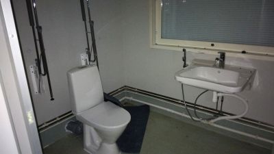 Viimeiseksi tehtiin inva-wc ja uusittiin keittiön lattia ja kaapistot